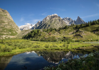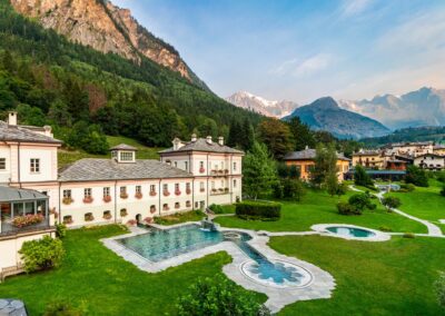 Quand nous pensons à l’été à Courmayeur, nous pensons aux sentiers qui partent de notre hôtel, au Skyway qui monte en altitude chercher l’air frais, à une journée simple en Val Ferret ou en Val Veny entre prairies et ruisseaux, à quelques heures aux thermes de Pré-Saint-Didier et à un plongeon dans la piscine alpine face aux montagnes. Ce sont les expériences que nous suggérons le plus souvent, parce qu’elles racontent vraiment notre façon de vivre la montagne en été.